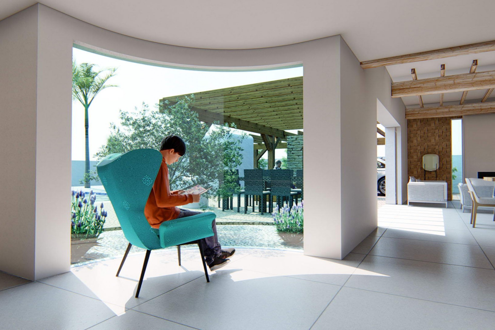 The exterior of this detached villa in Alfaz del Pi is designed to maximize enjoyment of the Mediterranean climate. It features a beautiful garden, ideal for relaxing or enjoying outdoor activities. The terrace is a perfect space for al fresco dining or simply enjoying the views and natural surroundings. Additionally, the property includes a private pool, offering a personal oasis for cooling off during warm summer days. The pergola adds a touch of elegance and provides shade, creating a welcoming outdoor atmosphere.