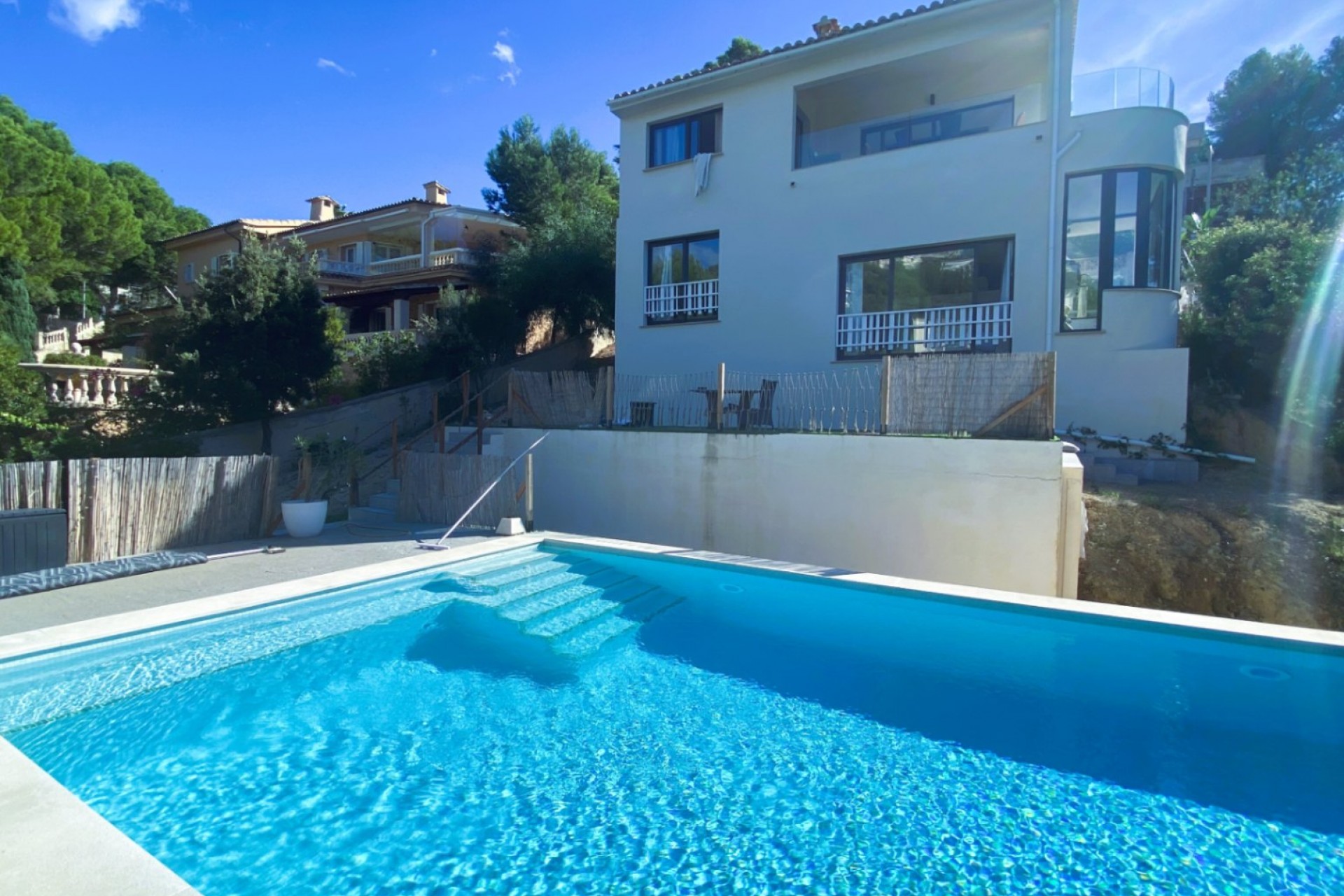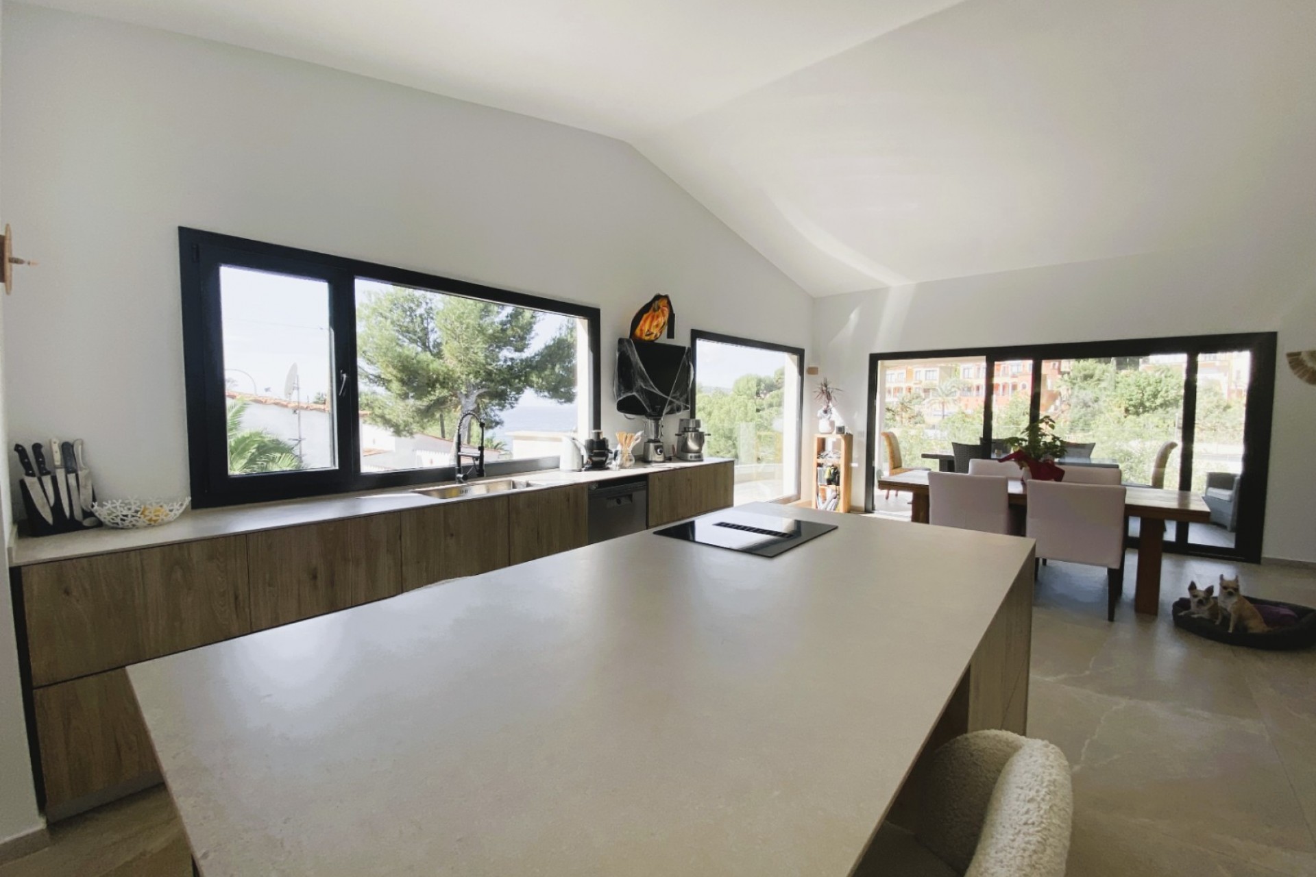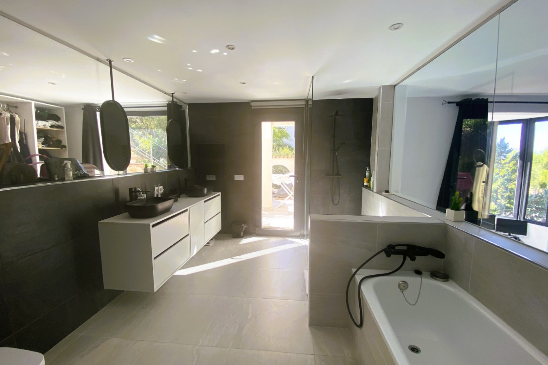 Cette élégante villa moderne à Costa de la Calma a été entièrement rénovée en 2022 et est située à un emplacement élevé, offrant une vue magnifique sur la mer. Entourée d'un jardin bien entretenu, d'arbres fruitiers matures, et avec un accès direct à la mer, c'est le refuge parfait pour vivre toute l'année ou pour des vacances. L'entrée de la maison se trouve au rez-de-chaussée, menant à un salon et une salle à manger ouverts et lumineux avec une cuisine intégrée. Depuis le salon, vous accédez à une grande terrasse offrant une vue panoramique imprenable sur la mer. À l'étage, vous trouverez trois chambres, chacune avec sa propre salle de bain attenante. La chambre principale dispose d'un spacieux dressing, d'une grande salle de bain avec vue sur la mer, et d'un bureau attenant. Deux autres chambres bénéficient également de vues panoramiques sur la mer. À l'arrière de la maison se trouve un espace piscine spacieux, idéal pour se détendre ou recevoir, avec un espace pour le jardinage, les barbecues, et d'autres activités de plein air. À côté de la piscine se trouve un appartement pour les invités entièrement équipé avec cuisine. La propriété comprend également un grand garage, deux débarras, et un toilette pour les invités. Située à seulement une minute à pied de la plage, cette villa est une escapade parfaite. Costa de la Calma est une zone paisible dans la municipalité de Calvià, au sud-ouest de Majorque. Elle est connue pour ses marinas, ses terrains de golf, ses écoles internationales, ses belles baies, et son excellente infrastructure. Palma est à 20 minutes en voiture, et l'aéroport à seulement 25 minutes. Avertissement : Certaines informations contenues dans ce document proviennent d'informations fournies par des propriétaires / collaborateurs. Toutes les informations fournies sont considérées comme fiables, mais ne sont pas garanties d'être exactes et doivent être vérifiées indépendamment.