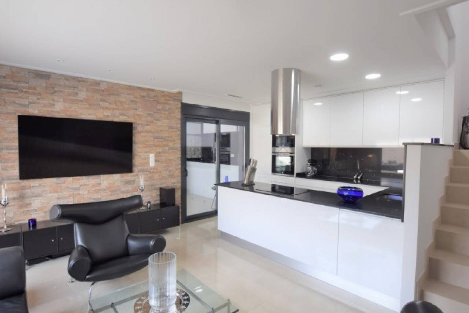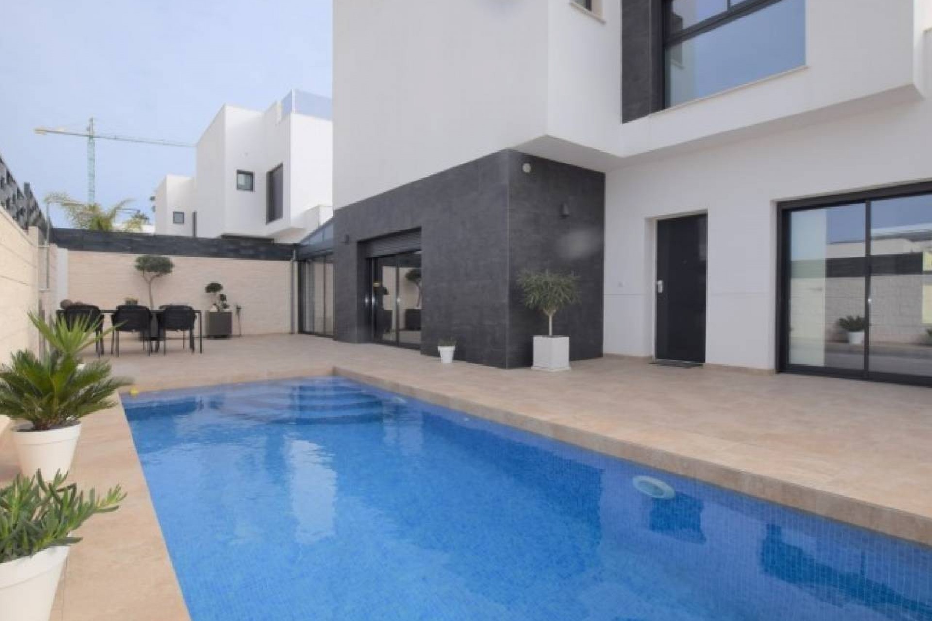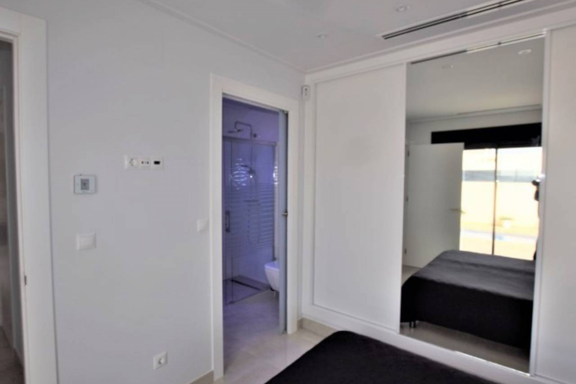 La propriété propose un hébergement spacieux de 3 chambres et 2 salles de bains, conçu et construit avec toutes les caractéristiques attrayantes de la nouvelle construction. Cette grande villa est répartie sur deux étages. Au rez-de-chaussée se trouve un grand salon avec un plan ouvert, une grande cuisine joliment équipée, avec des portes-fenêtres menant à la terrasse de la piscine à l'avant et un autre ensemble ouvrant sur une salle à manger vitrée séparée, également avec des portes sur la terrasse de la piscine. Il y a une chambre double et une salle de bain attenante au rez-de-chaussée avec un éclairage tamisé et des armoires encastrées. Il y a un vestiaire sous l'escalier menant au premier étage.