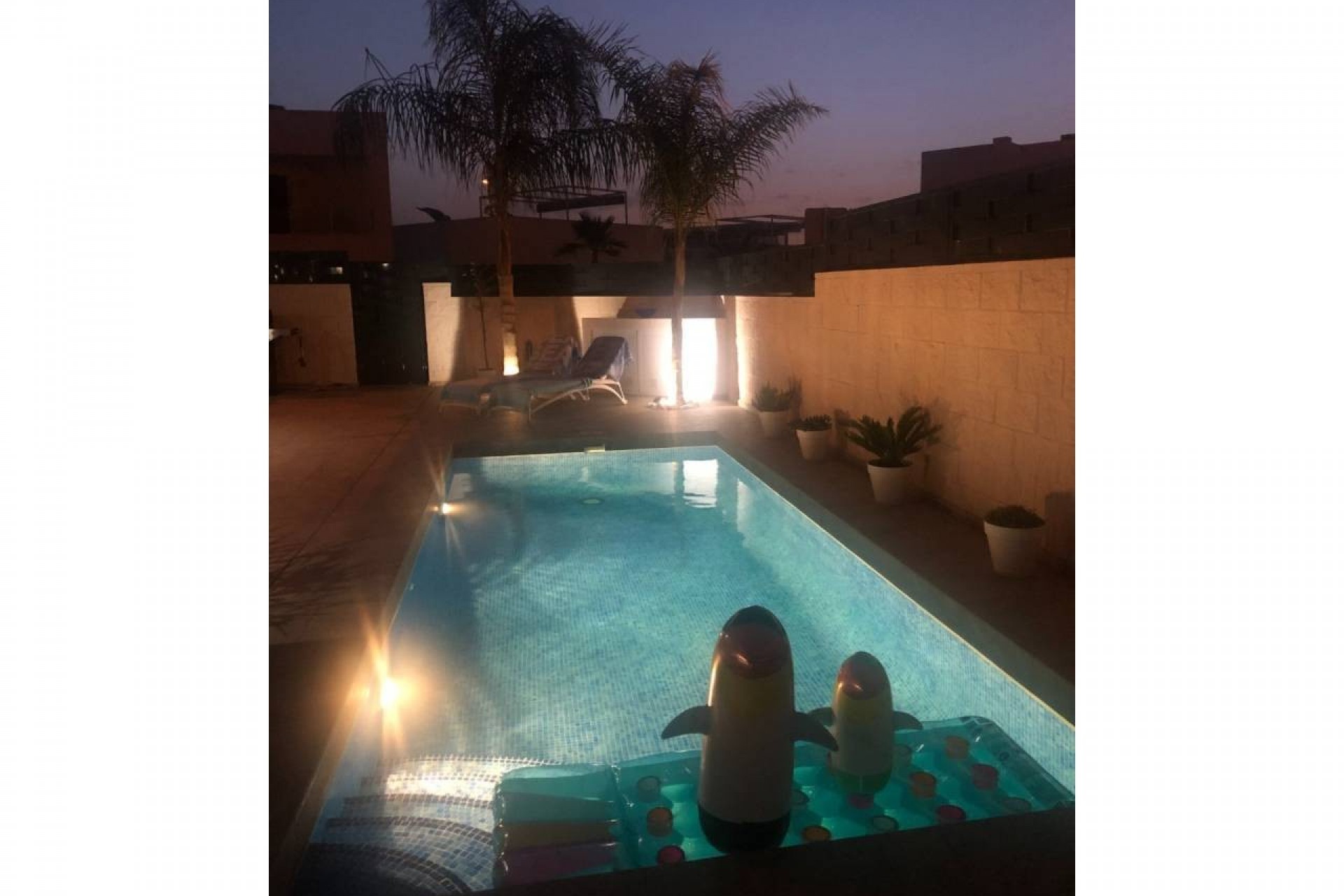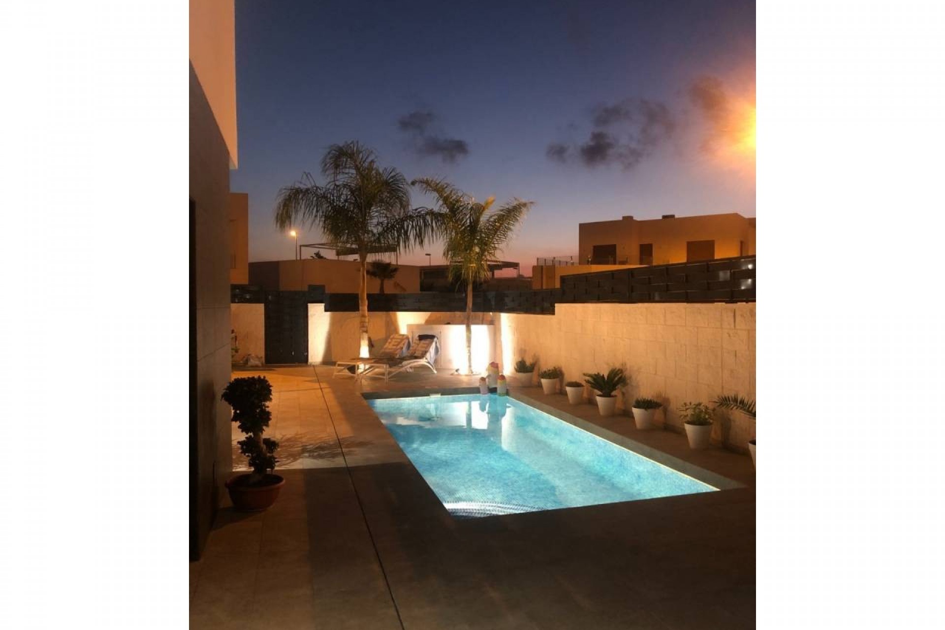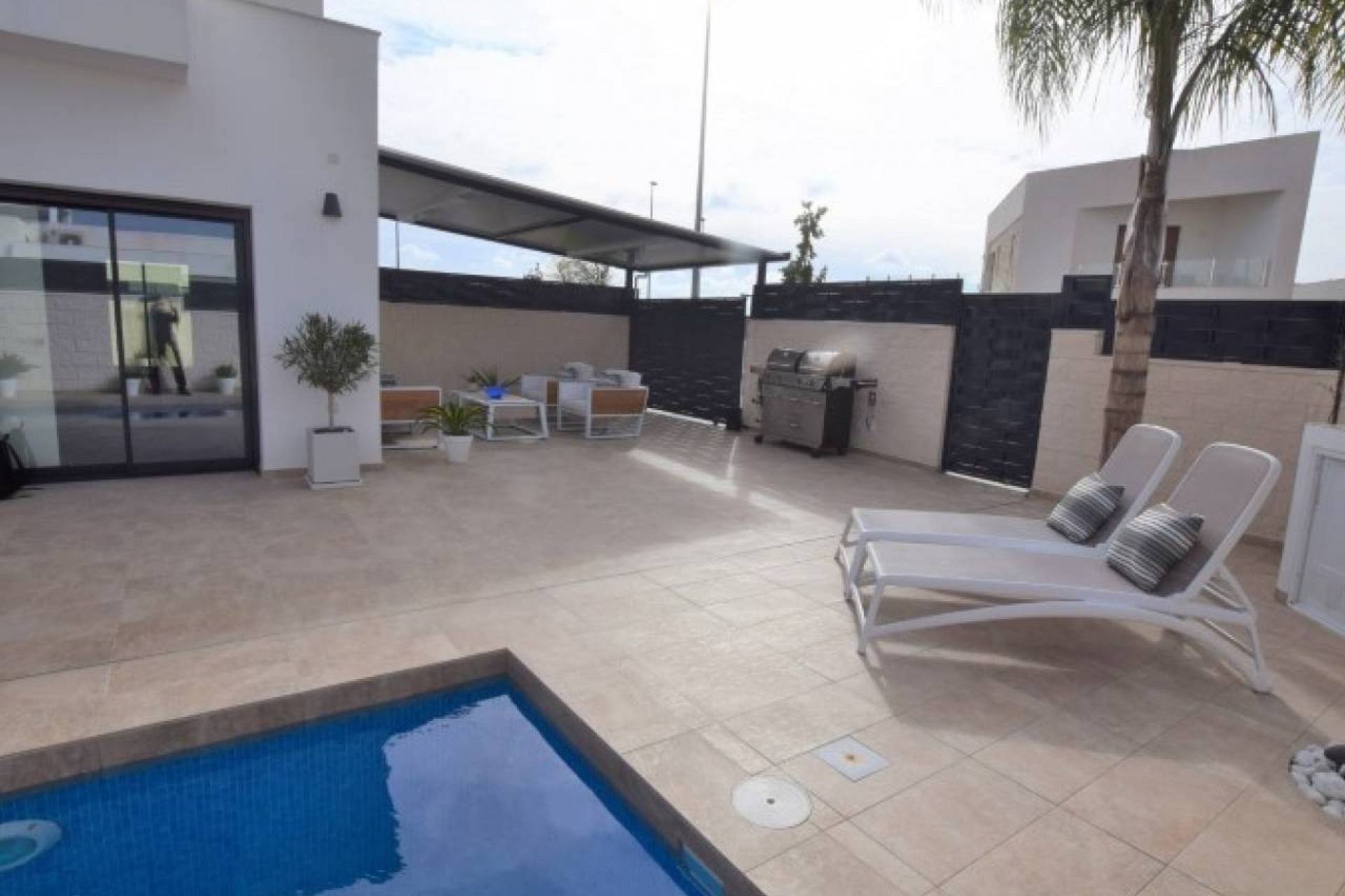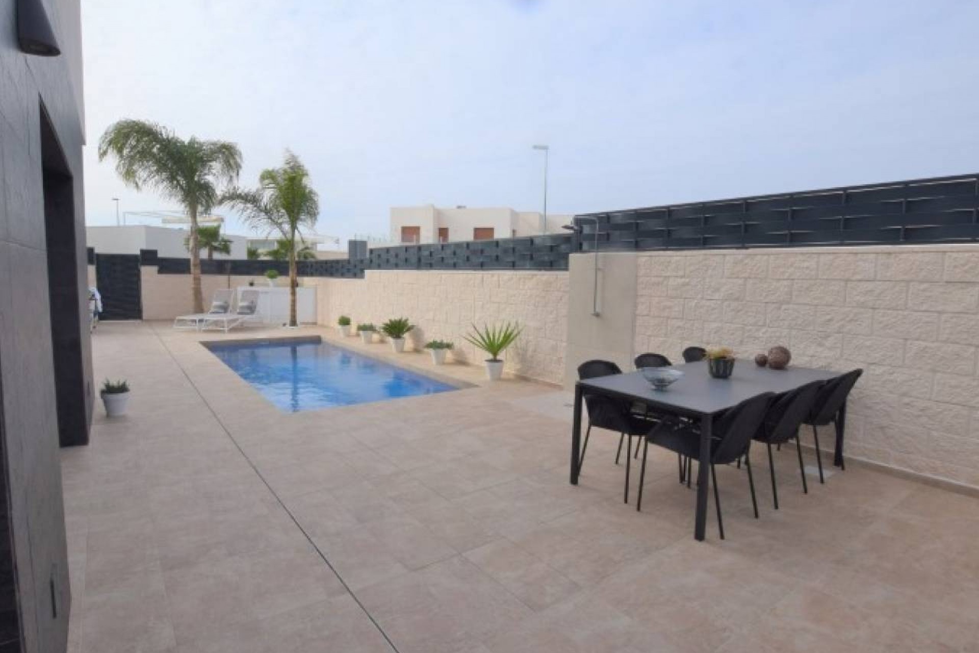 L'extérieur de la propriété est carrelé et facile à entretenir avec une belle piscine et divers coins salons.