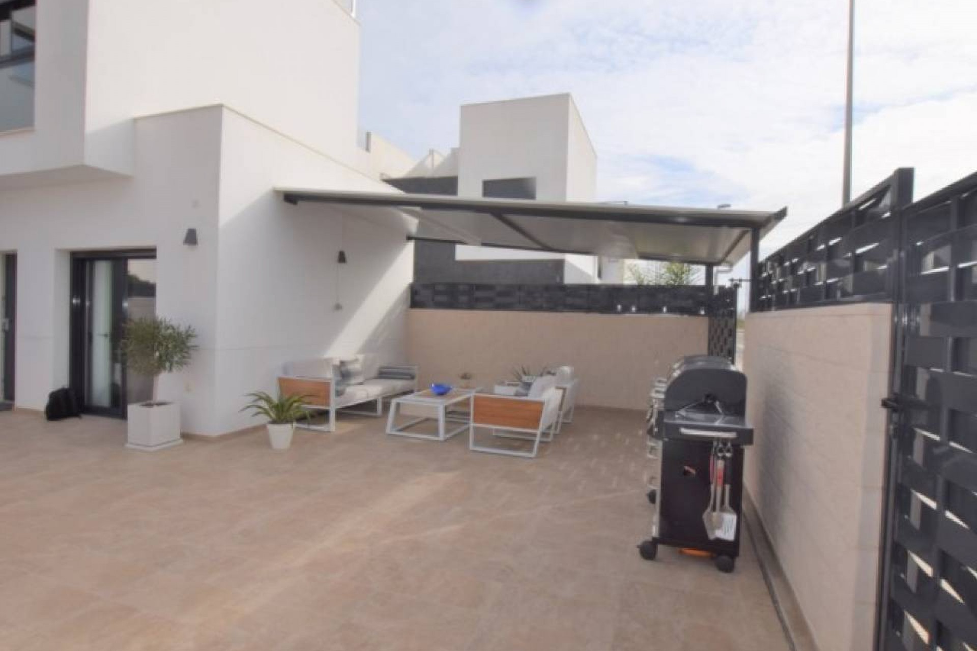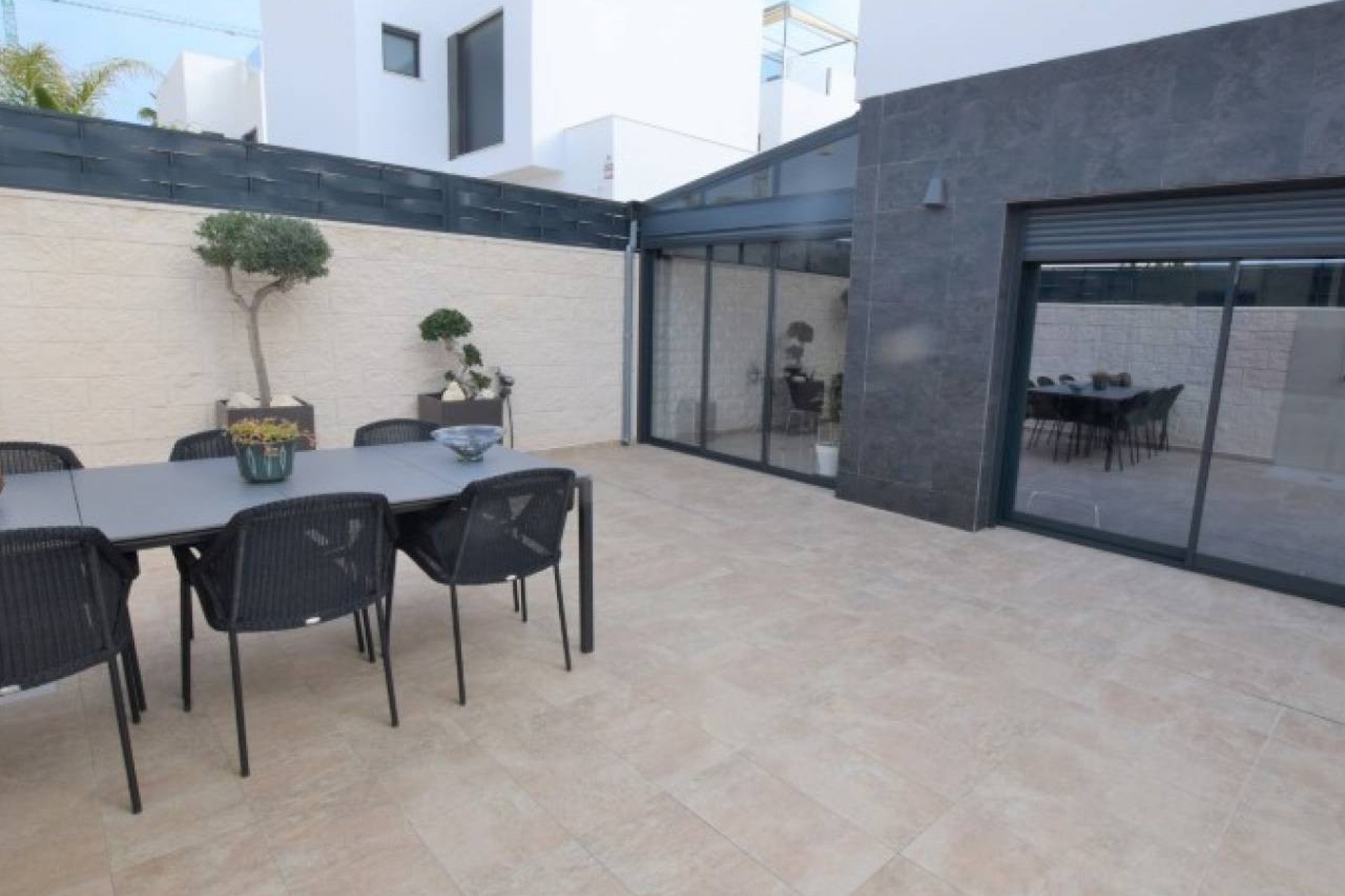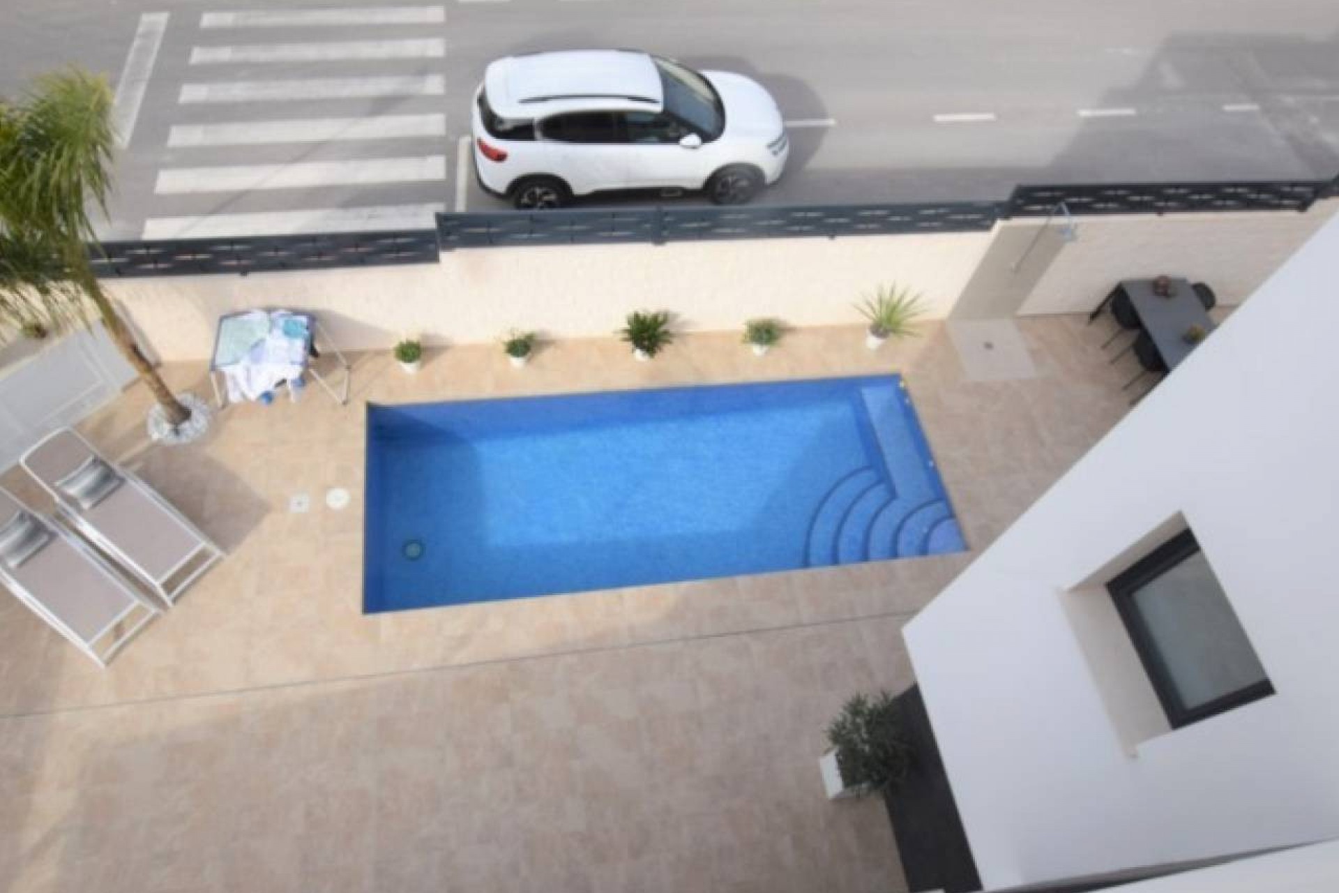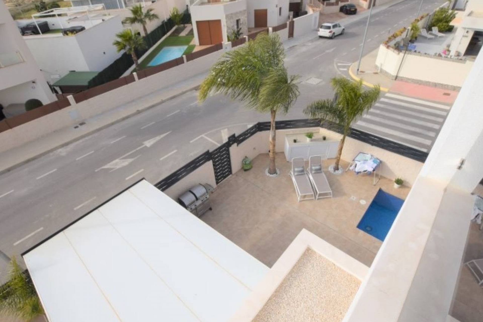 L'extérieur de la propriété est carrelé et facile à entretenir avec une belle piscine et divers coins salons.
