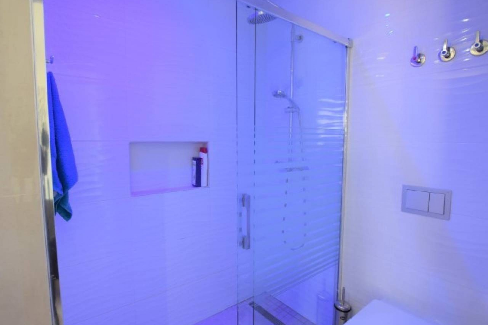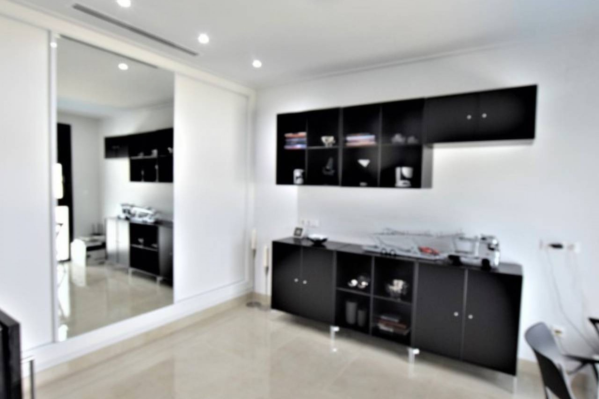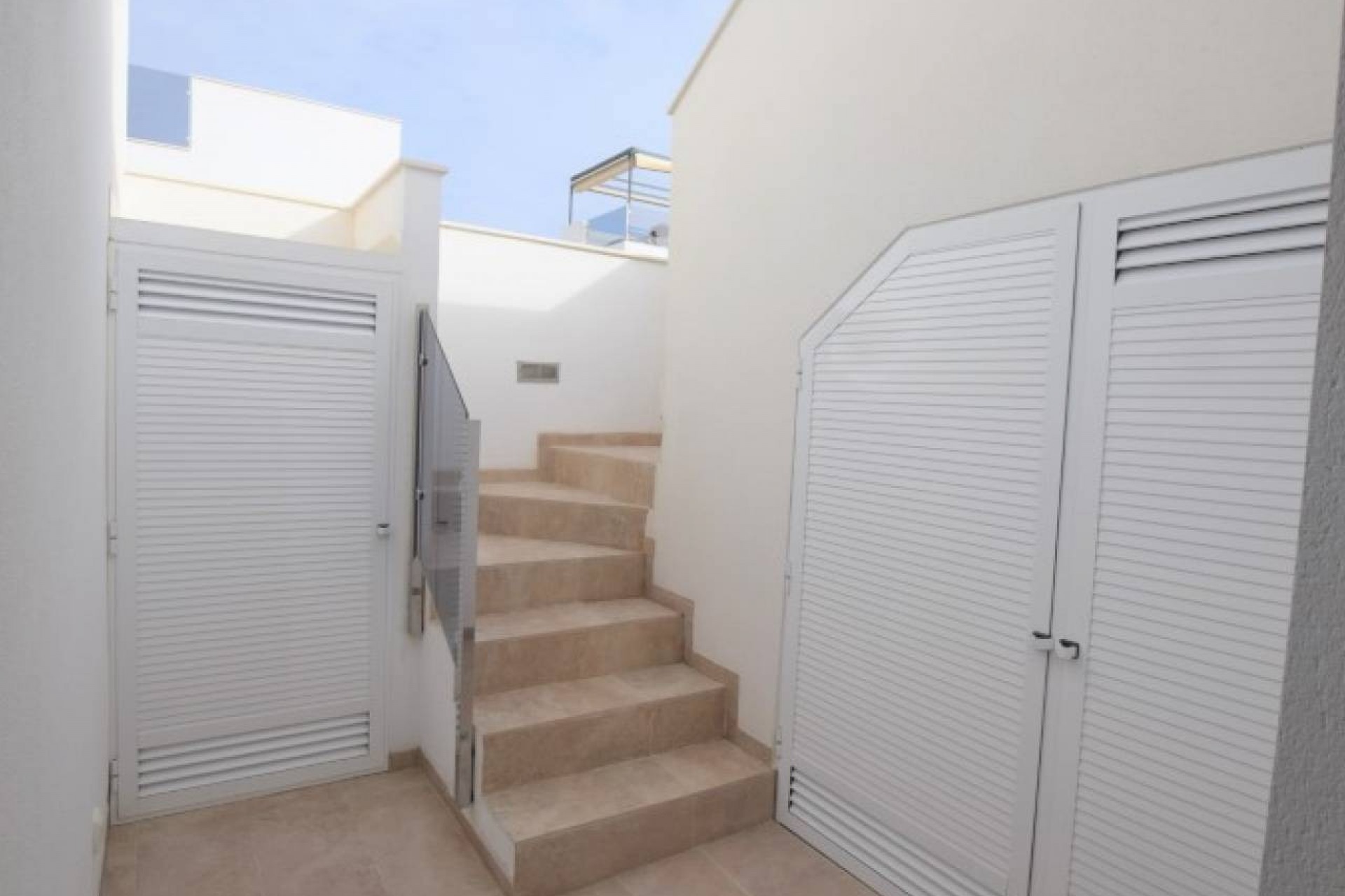 Des escaliers mènent à deux grandes chambres supplémentaires et à une salle de bains familiale, encore une fois avec toutes les caractéristiques de conception modernes. Le palier du premier étage a des portes menant à une zone fermée avec des rangements et des utilitaires dissimulés dans des placards. Les escaliers continuent jusqu'au grand solarium avec de nombreux sièges et espaces de loisirs.
