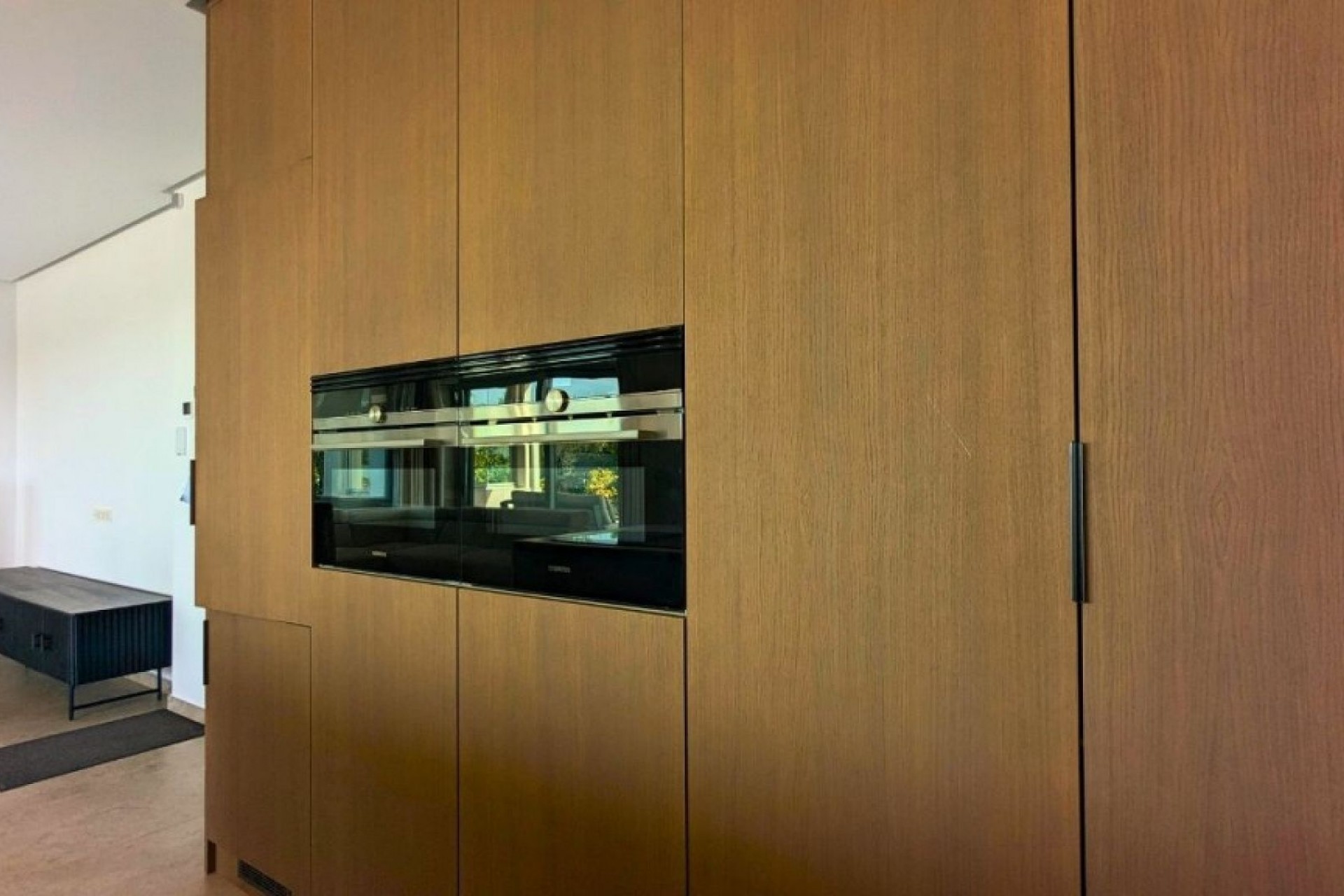 Een ruime woon- en eetkamer met een moderne keuken, die dankzij de grote schuifdeuren overvloedig natuurlijk licht binnenlaat. De schuifdeuren verdwijnen in de muur, waardoor u naadloos toegang heeft tot het beneden terras, het zwembad en de tuin.